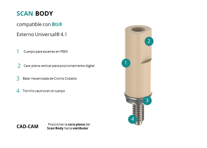 - CAD-CAM: Posicionar la cara plana del Scan Body hacia vestibular.