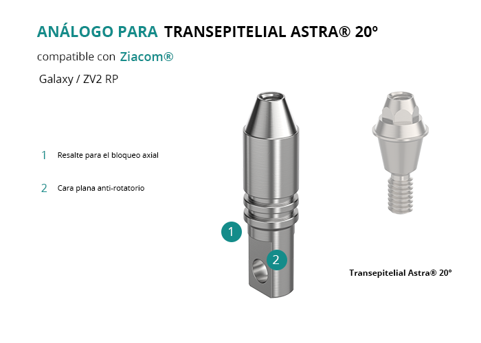 El análogo es una herramienta esencial para reproducir la geometría funcional del Transepitelial Astra® 20º, facilitando tanto la confección de restauraciones tradicionales como digitales. Es compatible con implantes Ziacom® de la plataforma Galaxy / ZV2 RP, asegurando resultados óptimos en restauraciones protésicas sobre implantes.