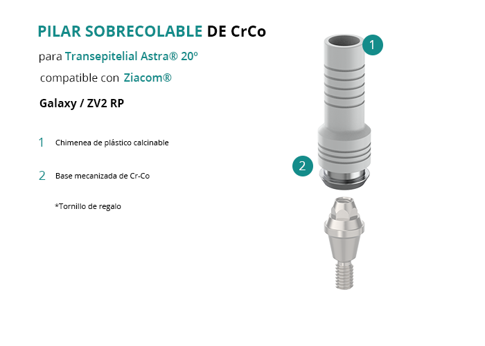 El Pilar Calcinable con Base de Cr-Co de GT-Medical es compatible con la línea de implantes Galaxy / ZV2 RP de la marca Ziacom®, proporciona una base sólida para la estructura protésica y garantiza un ajuste óptimo con el Transepitelial Astra® 20º. Está formado por una base mecanizada de Cromo Cobalto y una chimenea de plástico calcinable.