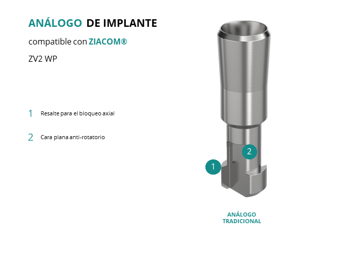 El análogo de GT-Medical compatible con la línea de implantes ZV2 WP de la marca Ziacom®, está fabricado en Acero Inoxidable, tiene un diámetro de 4.5mm, y replica con exactitud la conexión de este implante de Ziacom®.