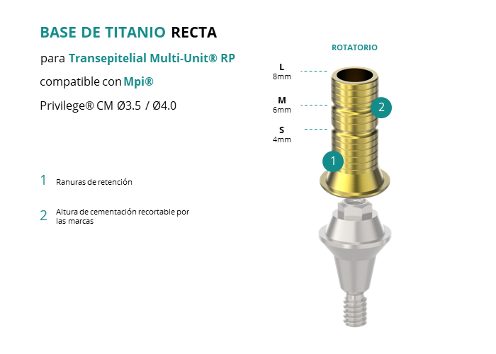 Las Ti-Base Rectas de GT-Medical son compatibles con los implantes Privilege® CM Ø3.5 / Ø4.0 de Mpi®, permitiendo una conexión estable y duradera entre el Transepitelial Multi-Unit® RP y la prótesis. Están compuestas en su totalidad por Titanio de Grado 5 con un anodizado dorado para un acabado más estético. Poseen un tronco de cementación ranurado y recortable a varias alturas.