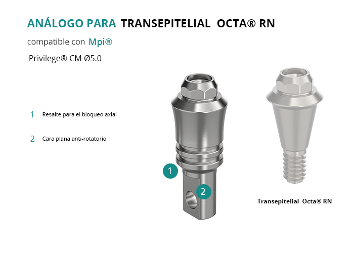 El análogo es una herramienta esencial para reproducir la geometría funcional del Transepitelial Octa® RN, facilitando tanto la confección de restauraciones tradicionales como digitales. Es compatible con implantes Mpi® de la plataforma Privilege® CM Ø5.0, asegurando resultados óptimos en restauraciones protésicas sobre implantes.