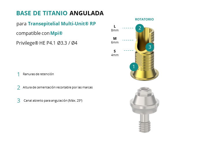 Las Ti-Base Anguladas de GT-Medical son compatibles con los implantes Privilege® HE P4.1 Ø3.3 / Ø4 de Mpi®, lo que asegura una conexión estable y duradera entre el Transepitelial Multi-Unit® RP y la prótesis, permitiendo además corregir angulaciones de hasta 25 grados. Están compuestas en su totalidad por Titanio de Grado 5 con un anodizado dorado para un acabado más estético. Poseen un tronco de cementación ranurado y recortable a varias alturas.