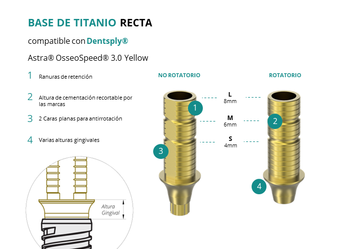 Las Ti-Base Rectas de GT-Medical son compatibles con los implantes Astra® OsseoSpeed® 3.0 Yellow de Dentsply®, permitiendo una conexión estable y duradera entre el implante y la prótesis. Están compuestas en su totalidad por Titanio de Grado 5 con un anodizado dorado para un acabado más estético. Poseen un tronco de cementación recortable a varias alturas, 2 caras planas para realizar la función antirotativa y un cuerpo gingival de varias alturas, dependiendo del tipo de conexión.