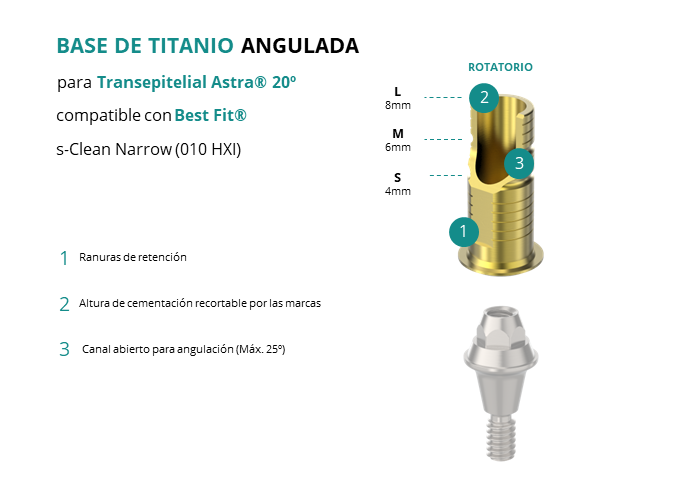 Las Ti-Base Anguladas de GT-Medical son compatibles con los implantes s-Clean Narrow (010 HXI) de Best Fit®, lo que asegura una conexión estable y duradera entre el Transepitelial Astra® 20º y la prótesis, permitiendo además corregir angulaciones de hasta 25 grados. Están compuestas en su totalidad por Titanio de Grado 5 con un anodizado dorado para un acabado más estético. Poseen un tronco de cementación ranurado y recortable a varias alturas.