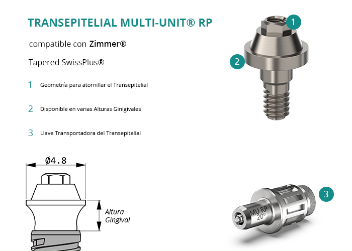 El Transepitelial Multi-Unit® RP de GT-Medical es compatible con los implantes Tapered SwissPlus® de Zimmer®, proporcionando una conexión duradera y estable para restauraciones múltiples. Tiene un diámetro de 4.8mm, y está fabricado en Titanio de Grado 5, garantiza una alta resistencia, biocompatibilidad y durabilidad en las restauraciones sobre implantes. Su diseño incluye varias alturas gingivales, lo que facilita la adaptación en diferentes perfiles de tejidos blandos y garantiza una estética óptima.