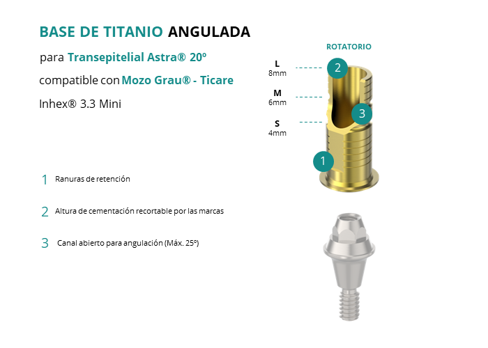 Las Ti-Base Anguladas de GT-Medical son compatibles con los implantes Inhex® 3.3 Mini de Mozo Grau® - Ticare, lo que asegura una conexión estable y duradera entre el Transepitelial Astra® 20º y la prótesis, permitiendo además corregir angulaciones de hasta 25 grados. Están compuestas en su totalidad por Titanio de Grado 5 con un anodizado dorado para un acabado más estético. Poseen un tronco de cementación ranurado y recortable a varias alturas.