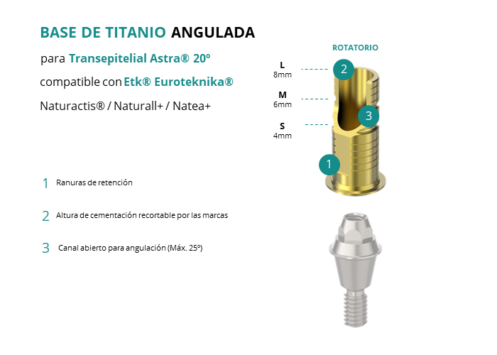 Las Ti-Base Anguladas de GT-Medical son compatibles con los implantes Naturactis® / Naturall+ / Natea+ de Etk® Euroteknika®, lo que asegura una conexión estable y duradera entre el Transepitelial Astra® 20º y la prótesis, permitiendo además corregir angulaciones de hasta 25 grados. Están compuestas en su totalidad por Titanio de Grado 5 con un anodizado dorado para un acabado más estético. Poseen un tronco de cementación ranurado y recortable a varias alturas.