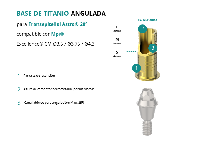 Las Ti-Base Anguladas de GT-Medical son compatibles con los implantes Excellence® CM Ø3.5 / Ø3.75 / Ø4.3 de Mpi®, lo que asegura una conexión estable y duradera entre el Transepitelial Astra® 20º y la prótesis, permitiendo además corregir angulaciones de hasta 25 grados. Están compuestas en su totalidad por Titanio de Grado 5 con un anodizado dorado para un acabado más estético. Poseen un tronco de cementación ranurado y recortable a varias alturas.