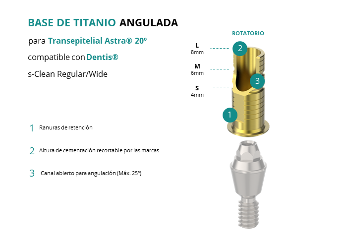 Las Ti-Base Anguladas de GT-Medical son compatibles con los implantes s-Clean Regular/Wide de Dentis®, lo que asegura una conexión estable y duradera entre el Transepitelial Astra® 20º y la prótesis, permitiendo además corregir angulaciones de hasta 25 grados. Están compuestas en su totalidad por Titanio de Grado 5 con un anodizado dorado para un acabado más estético. Poseen un tronco de cementación ranurado y recortable a varias alturas.