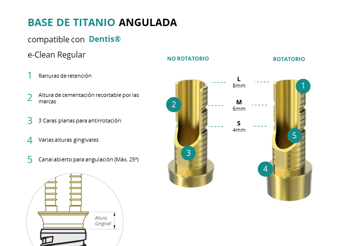 Las Ti-Base Anguladas de GT-Medical son compatibles con los implantes e-Clean Regular de Dentis®, facilitando una conexión estable y duradera entre el implante y la prótesis, y permitiendo corregir angulaciones de hasta 25 grados. Están compuestas en su totalidad por Titanio de Grado 5 con un anodizado dorado para un acabado más estético. Poseen un tronco de cementación recortable a varias alturas con canal abierto para permitir angulación, 3 caras planas para realizar la función antirotativa y un cuerpo gingival de varias alturas, dependiendo del tipo de conexión.