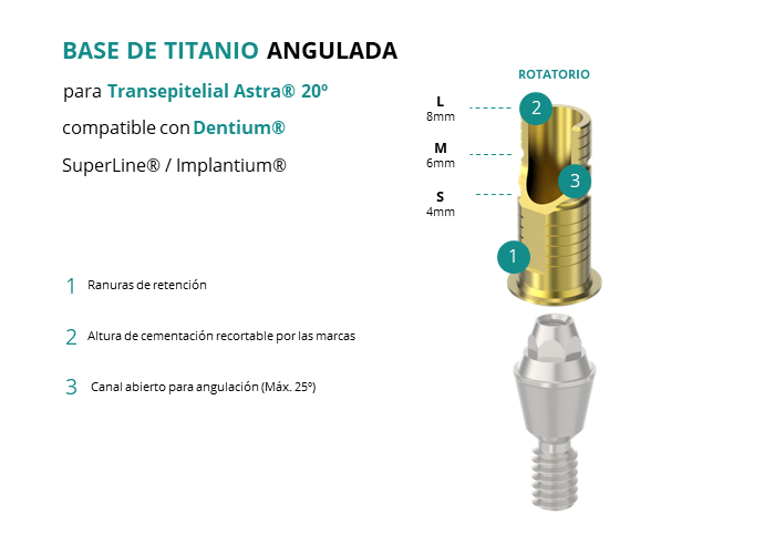 Las Ti-Base Anguladas de GT-Medical son compatibles con los implantes SuperLine® / Implantium® de Dentium®, lo que asegura una conexión estable y duradera entre el Transepitelial Astra® 20º y la prótesis, permitiendo además corregir angulaciones de hasta 25 grados. Están compuestas en su totalidad por Titanio de Grado 5 con un anodizado dorado para un acabado más estético. Poseen un tronco de cementación ranurado y recortable a varias alturas.