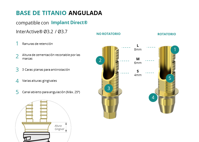 Las Ti-Base Anguladas de GT-Medical son compatibles con los implantes InterActive® Ø3.2 / Ø3.7 de Implant Direct®, facilitando una conexión estable y duradera entre el implante y la prótesis, y permitiendo corregir angulaciones de hasta 25 grados. Están compuestas en su totalidad por Titanio de Grado 5 con un anodizado dorado para un acabado más estético. Poseen un tronco de cementación recortable a varias alturas con canal abierto para permitir angulación, 3 caras planas para realizar la función antirotativa y un cuerpo gingival de varias alturas, dependiendo del tipo de conexión.