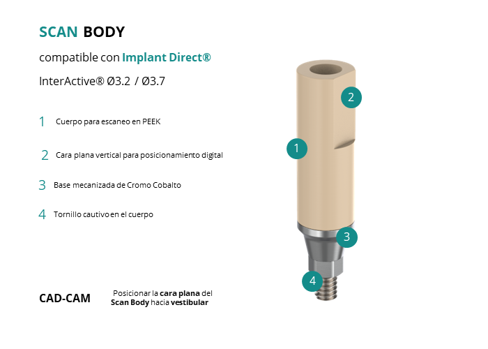 • CAD-CAM: Posicionar la cara plana del Scan Body hacia vestibular.