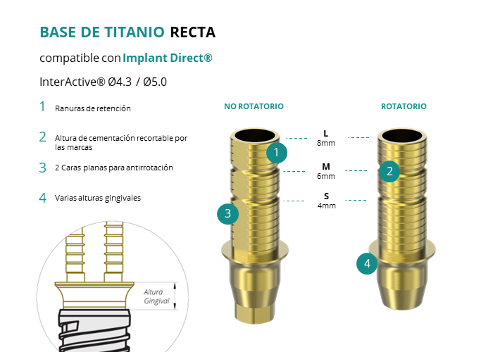 Las Ti-Base Rectas de GT-Medical son compatibles con los implantes InterActive® Ø4.3 / Ø5.0 de Implant Direct®, permitiendo una conexión estable y duradera entre el implante y la prótesis. Están compuestas en su totalidad por Titanio de Grado 5 con un anodizado dorado para un acabado más estético. Poseen un tronco de cementación recortable a varias alturas, 2 caras planas para realizar la función antirotativa y un cuerpo gingival de varias alturas, dependiendo del tipo de conexión.