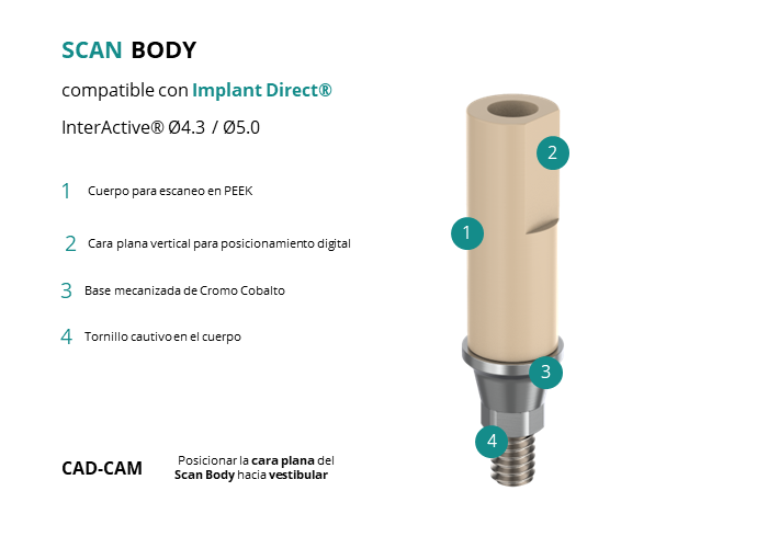 - CAD-CAM: Posicionar la cara plana del Scan Body hacia vestibular.