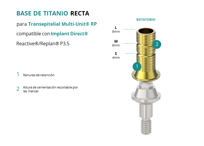 Las Ti-Base Rectas de GT-Medical son compatibles con los implantes Reactive®/Replan® P3.5 de Implant Direct®, permitiendo una conexión estable y duradera entre el Transepitelial Multi-Unit® RP y la prótesis. Están compuestas en su totalidad por Titanio de Grado 5 con un anodizado dorado para un acabado más estético. Poseen un tronco de cementación ranurado y recortable a varias alturas.