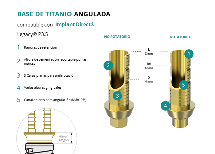 Las Ti-Base Anguladas de GT-Medical son compatibles con los implantes Legacy® P3.5 de Implant Direct®, facilitando una conexión estable y duradera entre el implante y la prótesis, y permitiendo corregir angulaciones de hasta 25 grados. Están compuestas en su totalidad por Titanio de Grado 5 con un anodizado dorado para un acabado más estético. Poseen un tronco de cementación recortable a varias alturas con canal abierto para permitir angulación, 3 caras planas para realizar la función antirotativa y un cuerpo gingival de varias alturas, dependiendo del tipo de conexión.