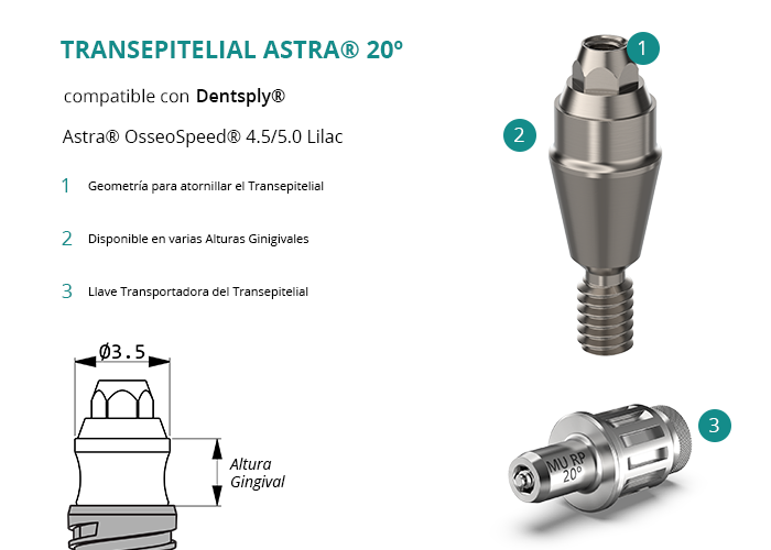 El Transepitelial Astra® 20º de GT-Medical es compatible con los implantes Astra® OsseoSpeed® 4.5/5.0 Lilac de Dentsply®, proporcionando una conexión duradera y estable para restauraciones múltiples. Tiene un diámetro de 3.5mm, y está fabricado en Titanio de Grado 5, garantiza una alta resistencia, biocompatibilidad y durabilidad en las restauraciones sobre implantes. Su diseño incluye varias alturas gingivales, lo que facilita la adaptación en diferentes perfiles de tejidos blandos y garantiza una estética óptima.