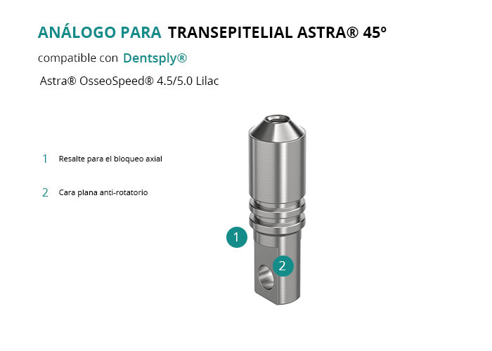 El análogo es una herramienta esencial para reproducir la geometría funcional del Transepitelial Astra® 45º, facilitando tanto la confección de restauraciones tradicionales como digitales. Es compatible con implantes Dentsply® de la plataforma Astra® OsseoSpeed® 4.5/5.0 Lilac, asegurando resultados óptimos en restauraciones protésicas sobre implantes.