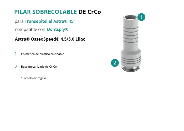 El Pilar Calcinable con Base de Cr-Co de GT-Medical es compatible con la línea de implantes Astra® OsseoSpeed® 4.5/5.0 Lilac de la marca Dentsply®, proporciona una base sólida para la estructura protésica y garantiza un ajuste óptimo con el Transepitelial Astra® 45º​. Está formado por una base mecanizada de Cromo Cobalto y una chimenea de plástico calcinable.
