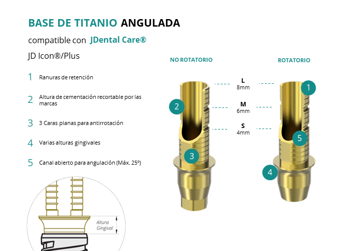 Las Ti-Base Anguladas de GT-Medical son compatibles con los implantes JD Icon®/Plus de JDental Care®, facilitando una conexión estable y duradera entre el implante y la prótesis, y permitiendo corregir angulaciones de hasta 25 grados. Están compuestas en su totalidad por Titanio de Grado 5 con un anodizado dorado para un acabado más estético. Poseen un tronco de cementación recortable a varias alturas con canal abierto para permitir angulación, 3 caras planas para realizar la función antirotativa y un cuerpo gingival de varias alturas, dependiendo del tipo de conexión.