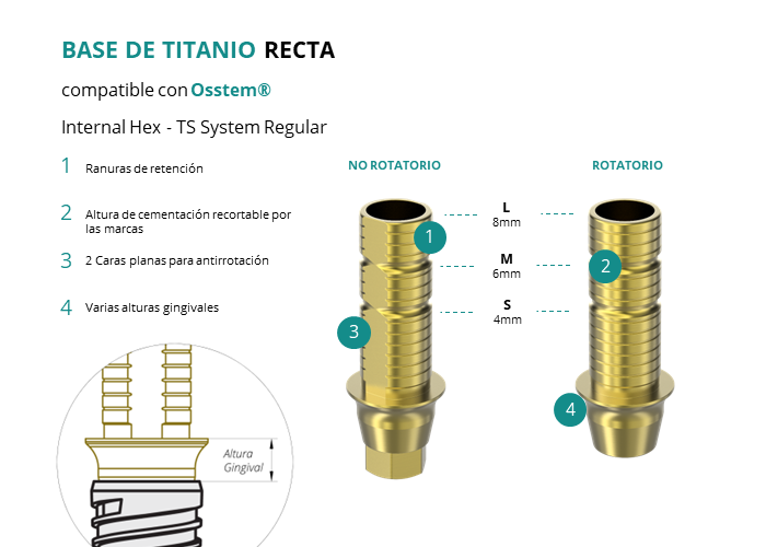 Las Ti-Base Rectas de GT-Medical son compatibles con los implantes Internal Hex - TS System Regular de Osstem®, permitiendo una conexión estable y duradera entre el implante y la prótesis. Están compuestas en su totalidad por Titanio de Grado 5 con un anodizado dorado para un acabado más estético. Poseen un tronco de cementación recortable a varias alturas, 2 caras planas para realizar la función antirotativa y un cuerpo gingival de varias alturas, dependiendo del tipo de conexión.