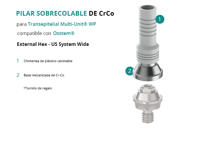 El Pilar Calcinable con Base de Cr-Co de GT-Medical es compatible con la línea de implantes External Hex - US System Wide de la marca Osstem®, proporciona una base sólida para la estructura protésica y garantiza un ajuste óptimo con el Transepitelial Multi-Unit® WP​. Está formado por una base mecanizada de Cromo Cobalto y una chimenea de plástico calcinable.