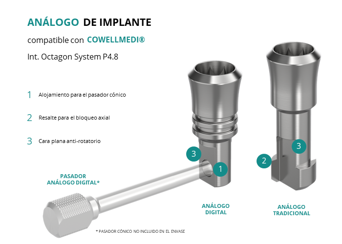 El análogo de GT-Medical compatible con la línea de implantes Int. Octagon System P4.8 de la marca Cowellmedi®, está fabricado en Acero Inoxidable, tiene un diámetro de 4.8mm, y replica con exactitud la conexión de este implante de Cowellmedi®.