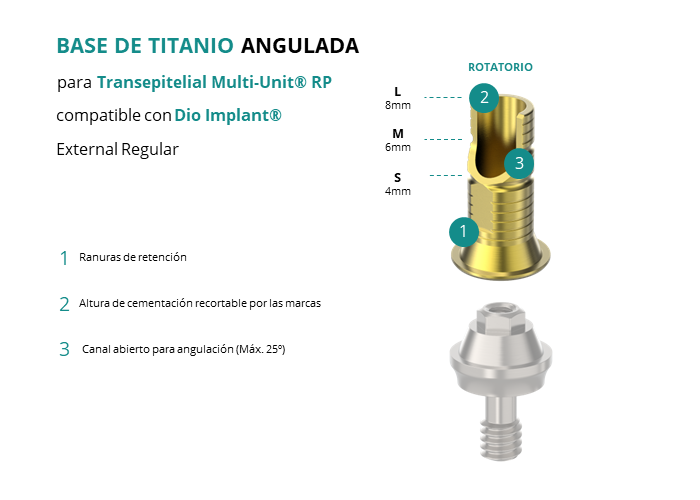 Las Ti-Base Anguladas de GT-Medical son compatibles con los implantes External Regular de Dio Implant®, lo que asegura una conexión estable y duradera entre el Transepitelial Multi-Unit® RP y la prótesis, permitiendo además corregir angulaciones de hasta 25 grados. Están compuestas en su totalidad por Titanio de Grado 5 con un anodizado dorado para un acabado más estético. Poseen un tronco de cementación ranurado y recortable a varias alturas.