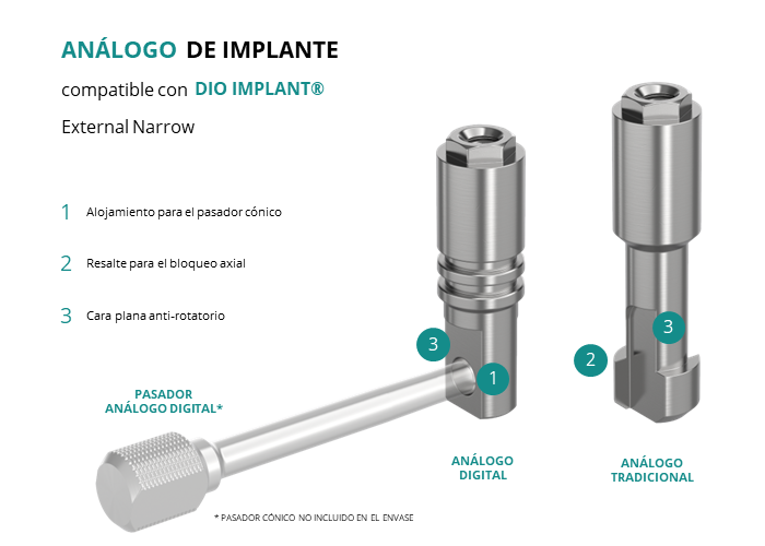 El análogo de GT-Medical compatible con la línea de implantes External Narrow de la marca Dio Implant®, está fabricado en Acero Inoxidable, tiene un diámetro de 3.5mm, y replica con exactitud la conexión de este implante de Dio Implant®.
