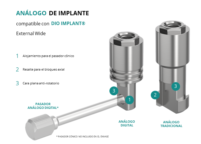 El análogo de GT-Medical compatible con la línea de implantes External Wide de la marca Dio Implant®, está fabricado en Acero Inoxidable, tiene un diámetro de 5.1mm, y replica con exactitud la conexión de este implante de Dio Implant®.