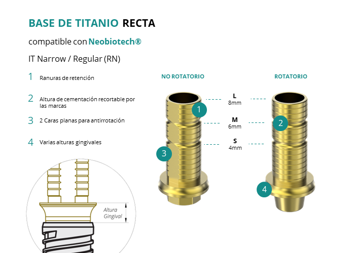 Las Ti-Base Rectas de GT-Medical son compatibles con los implantes IT Narrow / Regular (RN) de Neobiotech®, permitiendo una conexión estable y duradera entre el implante y la prótesis. Están compuestas en su totalidad por Titanio de Grado 5 con un anodizado dorado para un acabado más estético. Poseen un tronco de cementación recortable a varias alturas, 2 caras planas para realizar la función antirotativa y un cuerpo gingival de varias alturas, dependiendo del tipo de conexión.