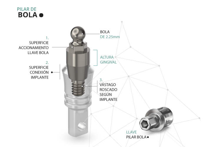La unión entre el Pilar de Bola y la estructura protésica se realiza por retención con la Goma O´ring.