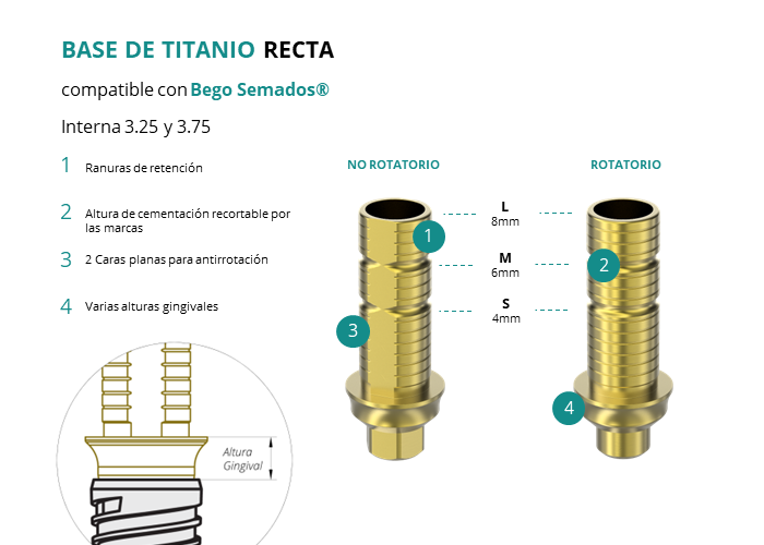 Las Ti-Base Rectas de GT-Medical son compatibles con los implantes Interna 3.25 y 3.75 de Bego Semados®, permitiendo una conexión estable y duradera entre el implante y la prótesis. Están compuestas en su totalidad por Titanio de Grado 5 con un anodizado dorado para un acabado más estético. Poseen un tronco de cementación recortable a varias alturas, 2 caras planas para realizar la función antirotativa y un cuerpo gingival de varias alturas, dependiendo del tipo de conexión.