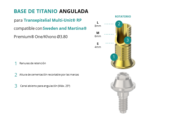 Las Ti-Base Anguladas de GT-Medical son compatibles con los implantes Premium® One/Khono Ø3.80 de Sweden and Martina®, lo que asegura una conexión estable y duradera entre el Transepitelial Multi-Unit® RP y la prótesis, permitiendo además corregir angulaciones de hasta 25 grados. Están compuestas en su totalidad por Titanio de Grado 5 con un anodizado dorado para un acabado más estético. Poseen un tronco de cementación ranurado y recortable a varias alturas.