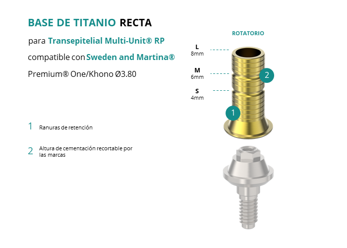 Las Ti-Base Rectas de GT-Medical son compatibles con los implantes Premium® One/Khono Ø3.80 de Sweden and Martina®, permitiendo una conexión estable y duradera entre el Transepitelial Multi-Unit® RP y la prótesis. Están compuestas en su totalidad por Titanio de Grado 5 con un anodizado dorado para un acabado más estético. Poseen un tronco de cementación ranurado y recortable a varias alturas.