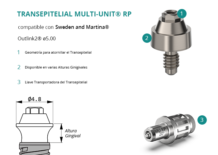 El Transepitelial Multi-Unit® RP de GT-Medical es compatible con los implantes Outlink2® Ø5.00 de Sweden and Martina®, proporcionando una conexión duradera y estable para restauraciones múltiples. Tiene un diámetro de 4.8mm, y está fabricado en Titanio de Grado 5, garantiza una alta resistencia, biocompatibilidad y durabilidad en las restauraciones sobre implantes. Su diseño incluye varias alturas gingivales, lo que facilita la adaptación en diferentes perfiles de tejidos blandos y garantiza una estética óptima.