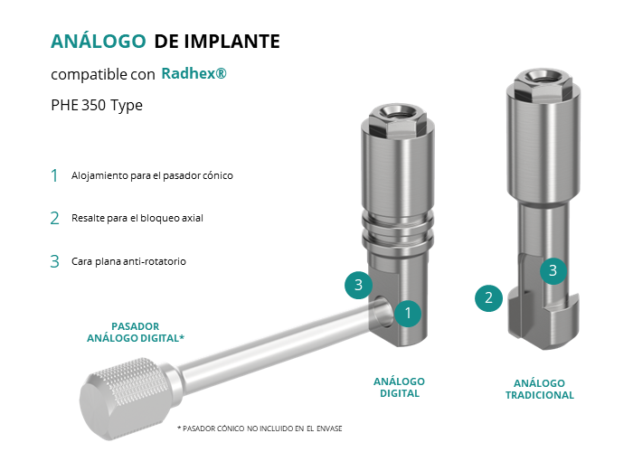El análogo de GT-Medical compatible con la línea de implantes PHE 350 Type de la marca Radhex®, está fabricado en Acero Inoxidable, tiene un diámetro de 3.5mm, y replica con exactitud la conexión de este implante de Radhex®.