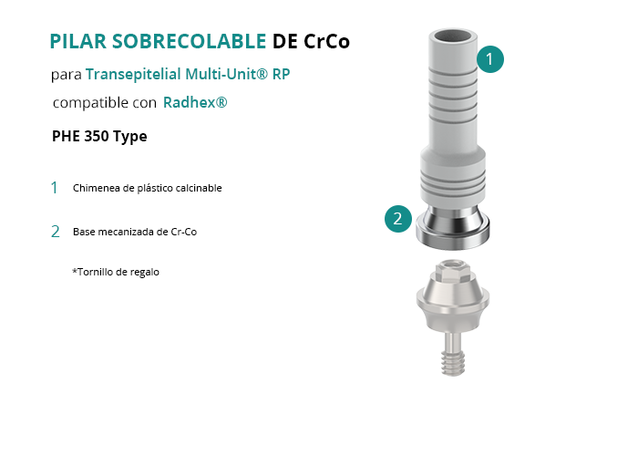 El Pilar Calcinable con Base de Cr-Co de GT-Medical es compatible con la línea de implantes PHE 350 Type de la marca Radhex®, proporciona una base sólida para la estructura protésica y garantiza un ajuste óptimo con el Transepitelial Multi-Unit® RP. Está formado por una base mecanizada de Cromo Cobalto y una chimenea de plástico calcinable.