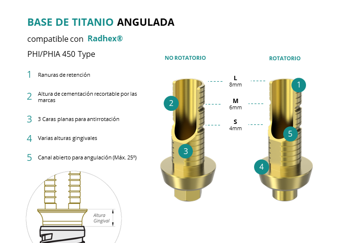 Las Ti-Base Anguladas de GT-Medical son compatibles con los implantes PHI/PHIA 450 Type de Radhex®, facilitando una conexión estable y duradera entre el implante y la prótesis, y permitiendo corregir angulaciones de hasta 25 grados. Están compuestas en su totalidad por Titanio de Grado 5 con un anodizado dorado para un acabado más estético. Poseen un tronco de cementación recortable a varias alturas con canal abierto para permitir angulación, 3 caras planas para realizar la función antirotativa y un cuerpo gingival de varias alturas, dependiendo del tipo de conexión.