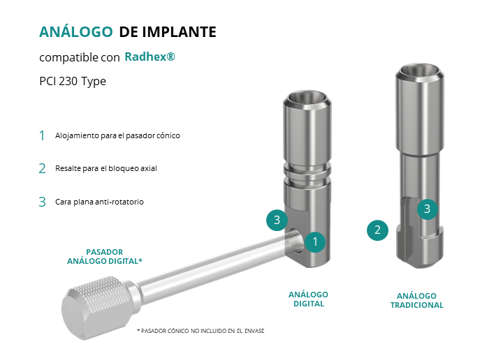 El análogo de GT-Medical compatible con la línea de implantes PCI 230 Type de la marca Radhex®, está fabricado en Acero Inoxidable, tiene un diámetro de 3.0mm, y replica con exactitud la conexión de este implante de Radhex®.